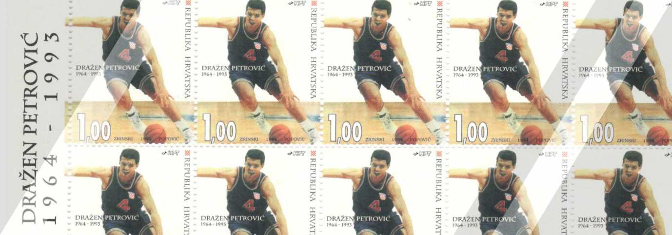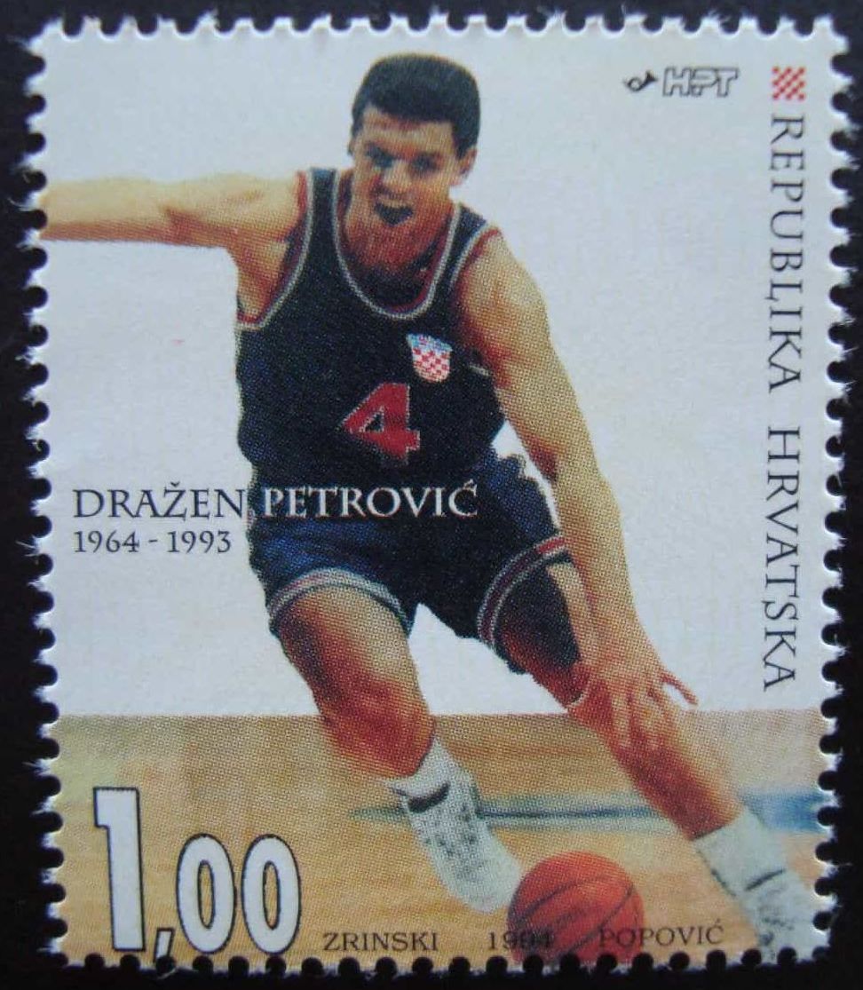 - Prigodna poštanska marka Dražen Petrović (1964 – 1993); autor Danijel Popović, veličina: 29,82 x 35,50 mm, materijal: papir bijeli 90 gr. gumirani, zupčanje češljasto: 14, tisak: višebojni ofset, Tiskara: Zrinski d. d. Čakovec, naklada: 1000000, datum izdanja: 7. lipnja 1994., vrijednost: 1 HRK. Marka je tiskana u arcima od 20 komada.