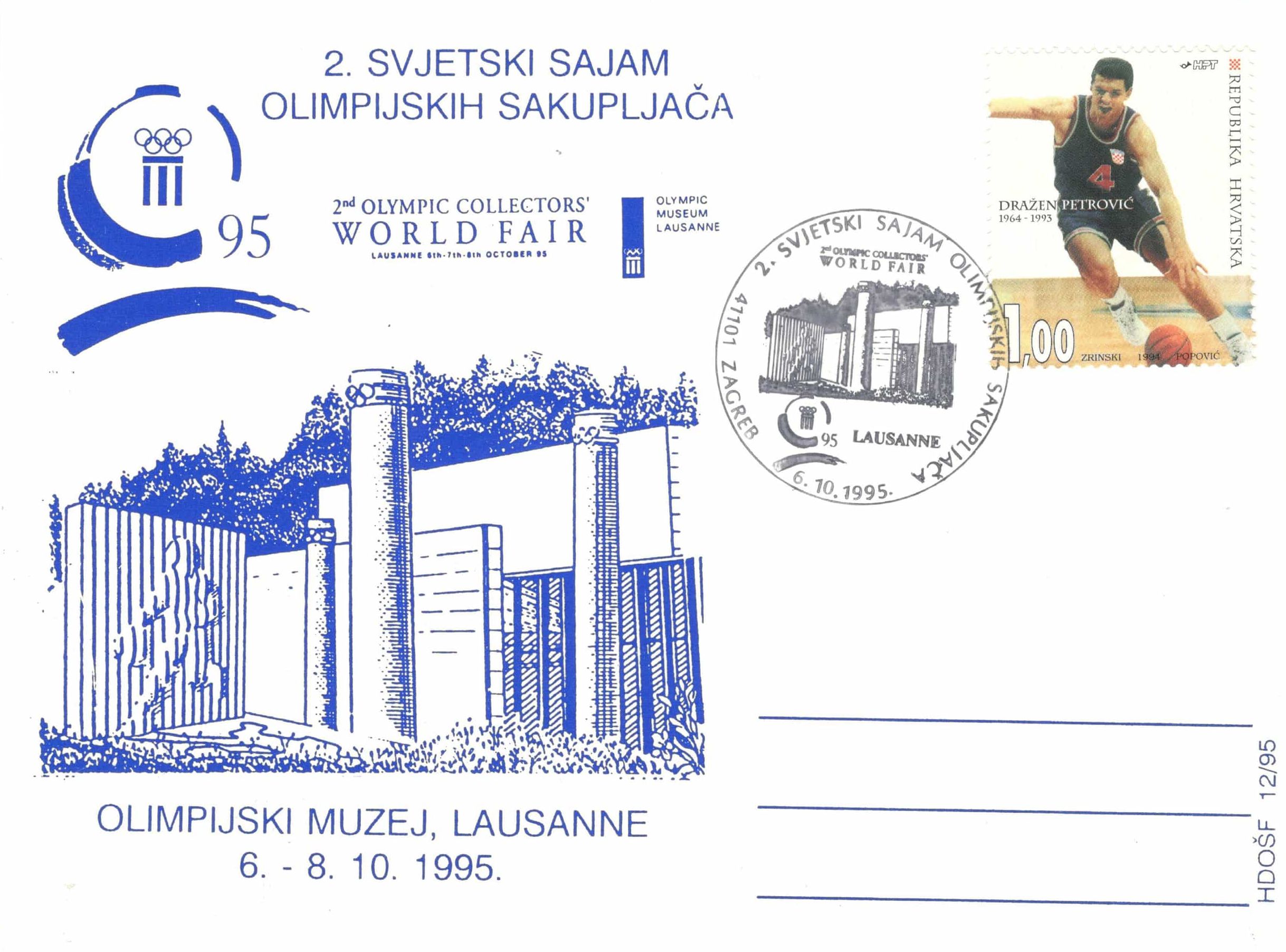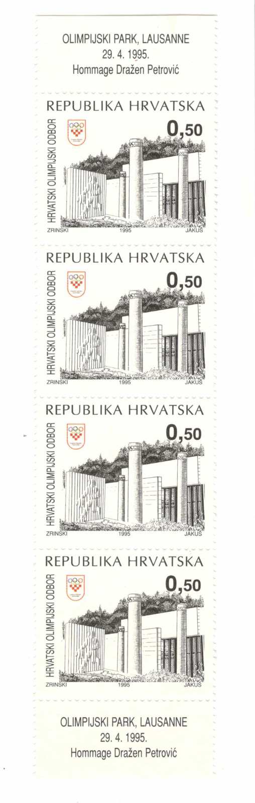 2. Poštanska marka Olimpijski park, Lausanne 29. 4. 1995. Hommage Dražen Petrović, autor Zlatko Jakuš[1], 3 x 3,6 cm