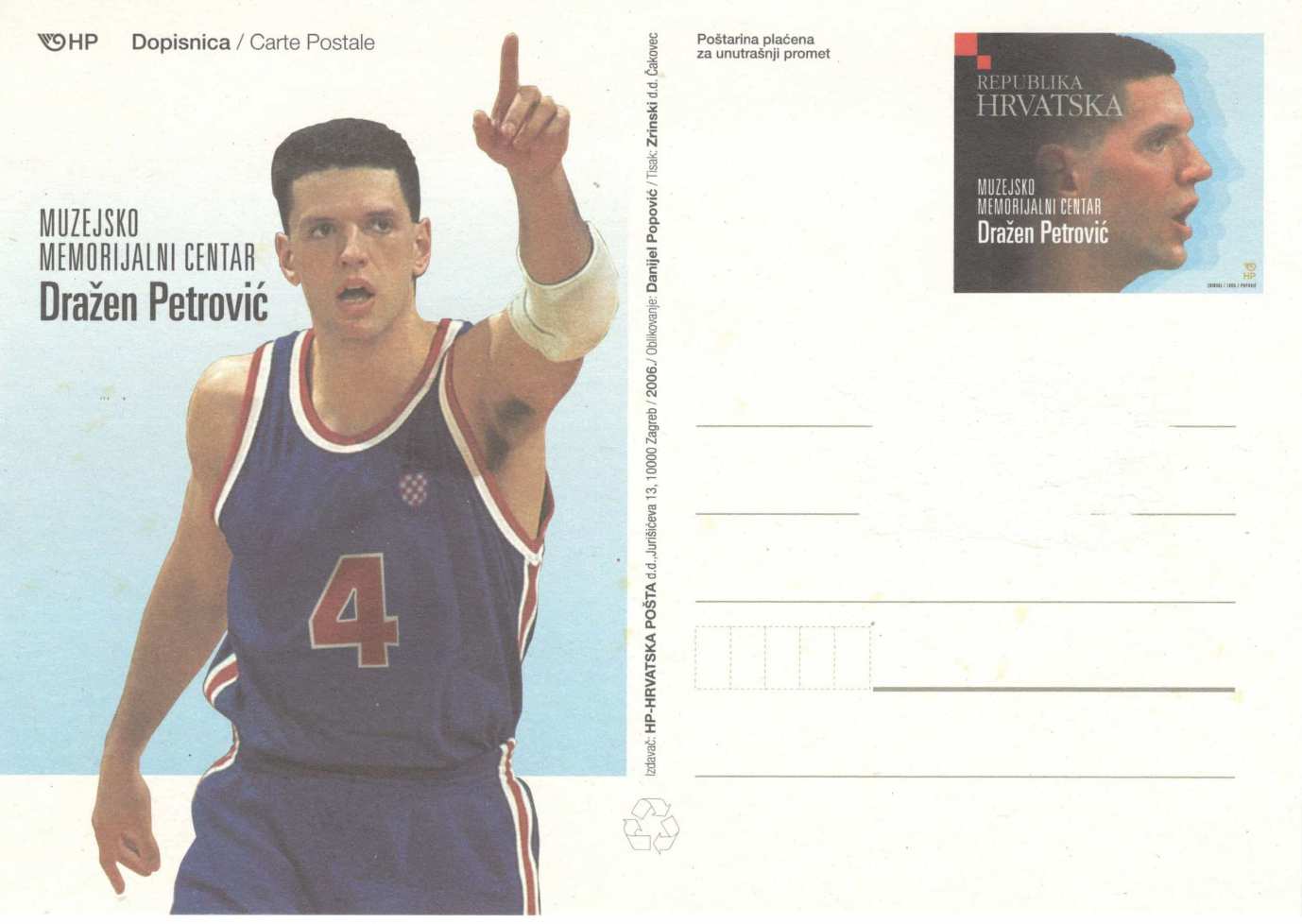 3. Dopisnica Dražen Petrović izdana je na prijedlog Zaklade Dražen Petrović u povodu otvorenja Muzejsko-memorijalnog centra Dražen Petrović 7. lipnja 2006. godine. Dopisnica ima otisnutu marku bez nominalne vrijednosti, tiskana je u čakovečkoj tiskari Zrinski u višebojnom ofsetu na 190-gramskom bijelom recikliranom papiru u nakladi od 200.000 primjeraka. Prodajna cijena dopisnice bila je 1,80 kuna, a dizajnirao ju je Danijel Popović.